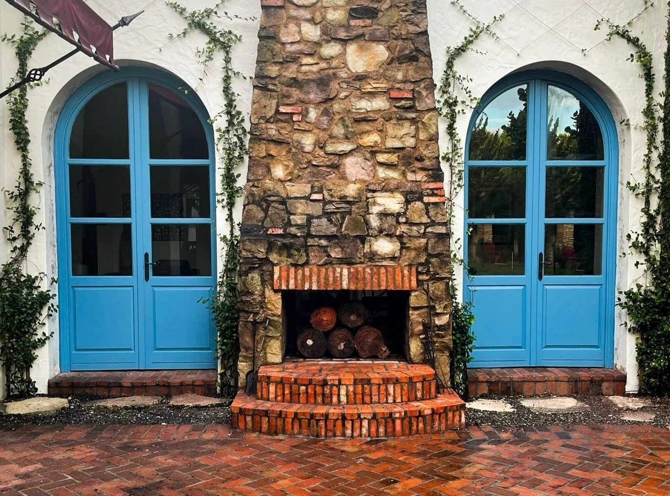 Italian inspired arched doors made from Sapele Wood and painted a light blue.