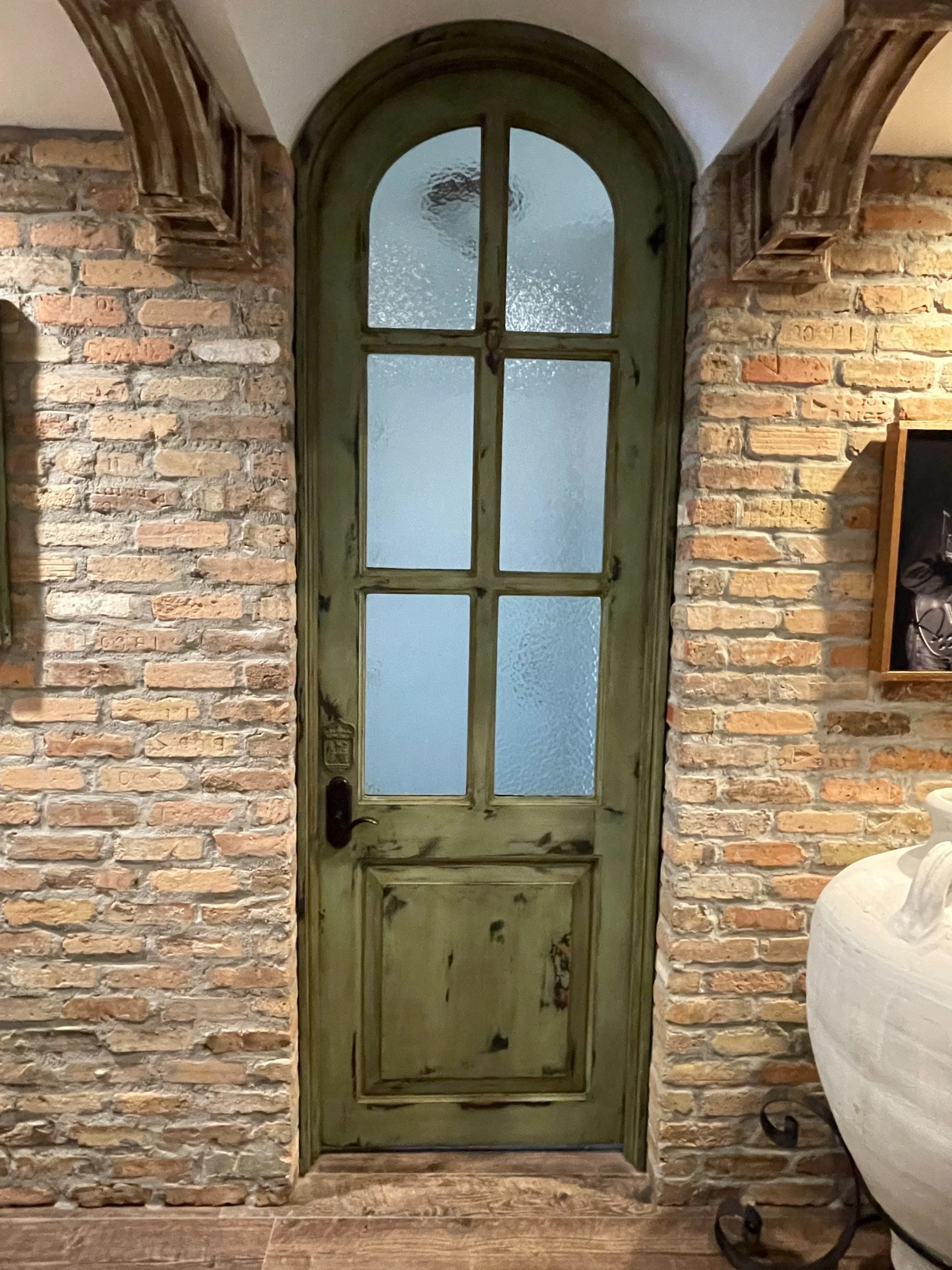 Arched Interior Door number 2 with a Sea Foam green and aged to look like an antique. Family Crest carved in Wood.